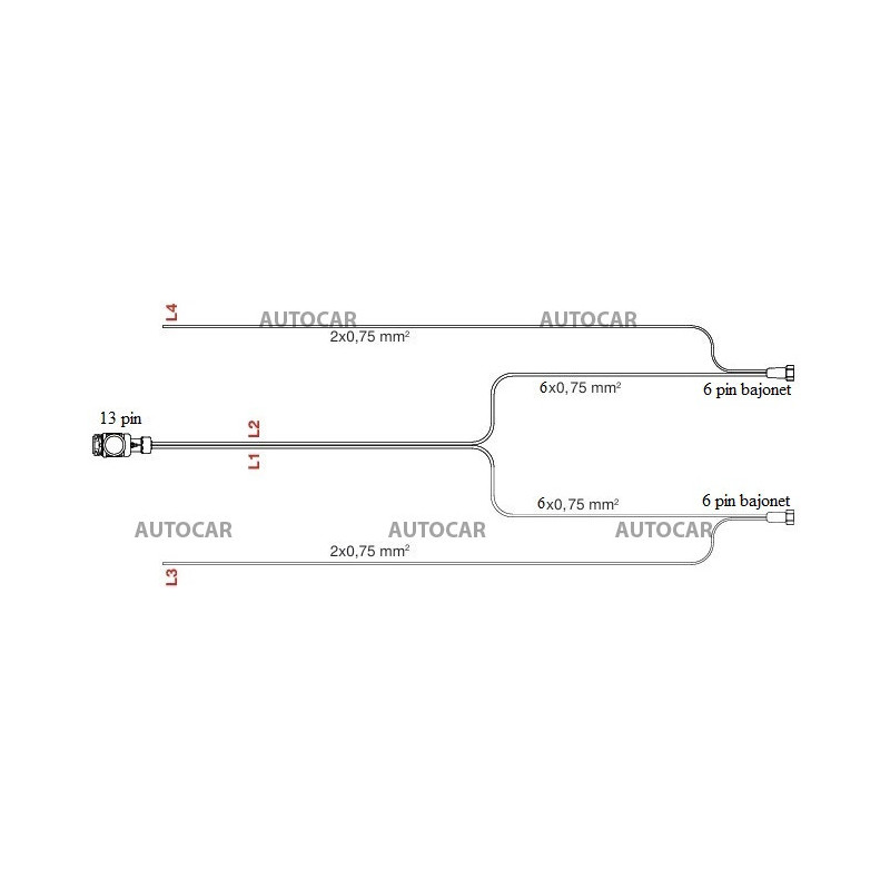 Verkabelung für einen Anhänger mit 13-poligem Stecker und Positionslichtern. Die Verkabelung verfügt über ein 6-poliges Bajonett für eine schnelle und zuverlässige Verbindung der Lichter. (im Bild)