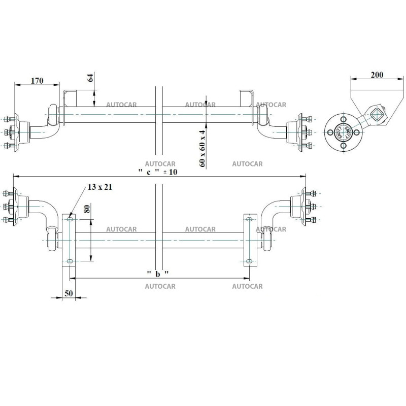 KNOTT Achse , Typ VG7-L, ungebremst, Tragfähigkeit bis 750 kg, Abstand der Befestigungslöcher 1000 mm, Achsbreite durch Naben 1430 mm, Nabenverschraubung 100x4
