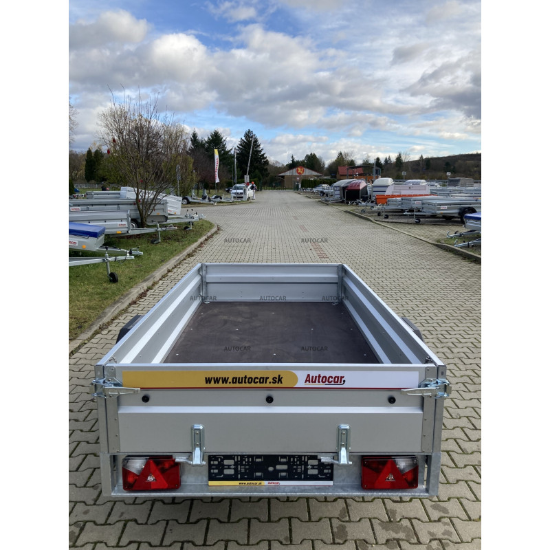 Dieser einachsige gebremste absenkbare Pritschenanhänger ist vielseitig einsetzbar, mit Rädern, die sich neben der Ladefläche befinden, und Aufsatzwänden. Die Konstruktion besteht aus einer robusten, feuerverzinkten geschweißten Stahlkonstruktion, die eine lange Lebensdauer gewährleistet. Zur Standardausrüstung gehören: Stützrad, verzinkte Seitenwände mit einer Höhe von 79 cm, 4 Bodenhalterungen, vordere und hintere Klappe, die hintere Klappe ist mit Sperrholz verstärkt und dient als Rampe. Der Anhänger hat eine Garantie von 2 Jahren und ist für eine Geschwindigkeit von 140 km/h ausgelegt.