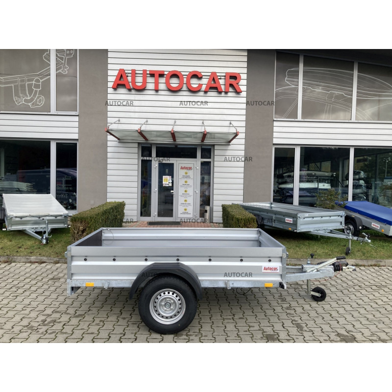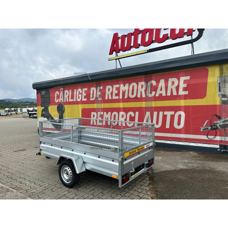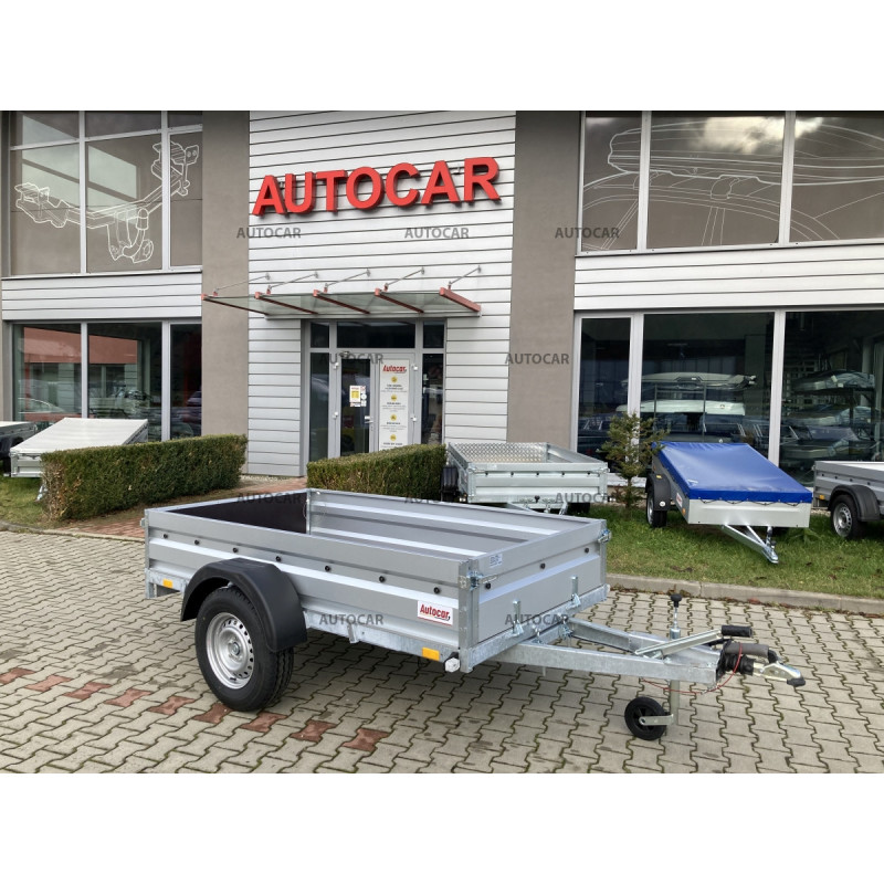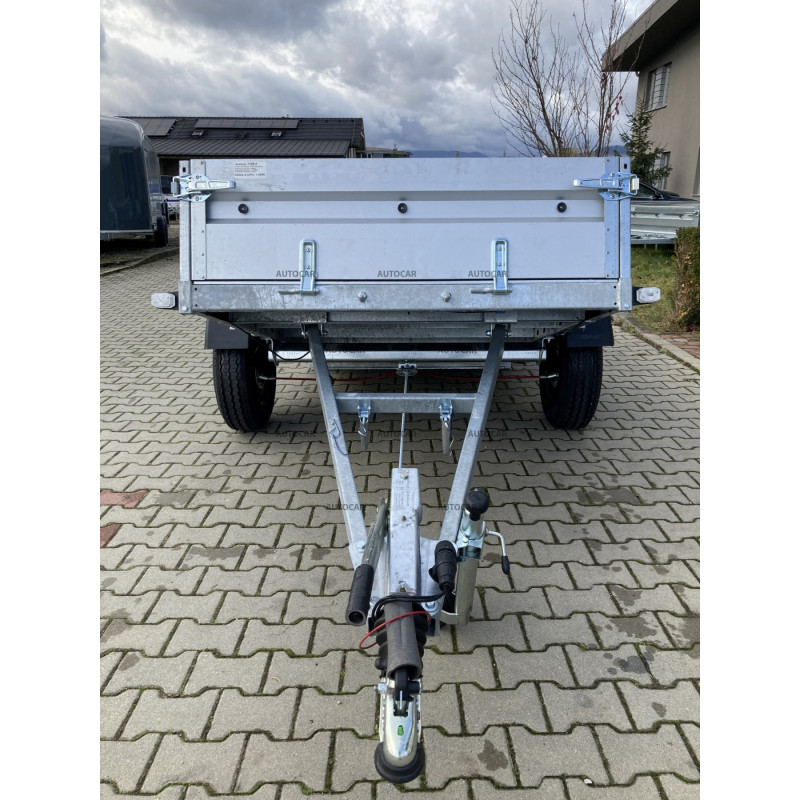 Ein einachsiger gebremster absenkbarer Lastenanhänger für vielseitige Anwendungen, mit Rädern, die neben der Ladefläche montiert sind und einem Aufbau-Netz. Die Konstruktion besteht aus einer robusten, feuerverzinkten geschweißten Stahlkonstruktion, die eine langjährige Lebensdauer gewährleistet. Zur Grundausstattung gehören: ein Stützrad, verzinkte Bordwände mit einer Höhe von 79 cm, 4x Bodenverankerung, eine vordere und eine hintere klappbare Stirnwand, wobei die hintere Stirnwand mit Sperrholz verstärkt ist und als Auffahrrampe dient. Der Anhänger hat eine Garantie von 2 Jahren und ist für eine Geschwindigkeit von 100 km/h ausgelegt.