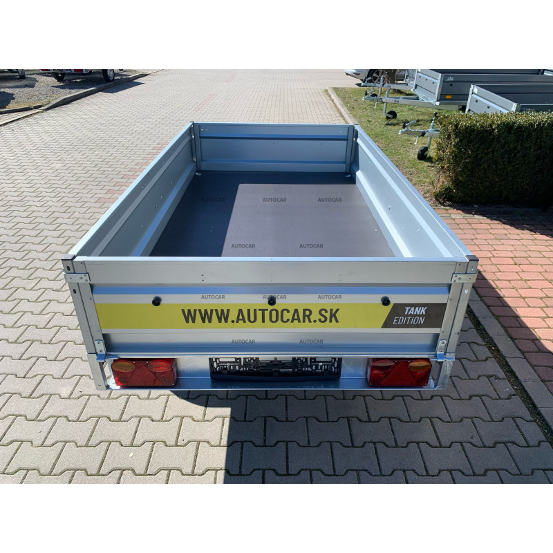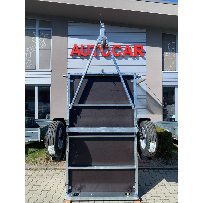 Der faltbare eine-achse ungebremst Anhänger mit robustem geschweißt (7 cm hoch), Querverstärkung und verstärkter Achse und Gelenk bis 1300 kg stellt eine zuverlässige Lösung für den Transport jeglicher Ladung dar. Sein U-Profilrahmen und die C-Profildeichsel bestehen aus bis zu 2,5 mm dickem Material. Seine breite Ladefläche mit den Maßen 2430 x 1330 und einer bordwände von 390 mm, aber das Wichtigste ist die bordwände von bis zu 1 mm, die Stabilität und Langlebigkeit garantiert. Dieser Wagen ist mit einem wasserfesten Sperrholzboden und vier Bodenösen ausgestattet. Die klappbare Konstruktion der 8 cm hohen Deichsel ermöglicht ein einfaches Be- und Entladen der Ladung und macht diesen Anhänger für verschiedene Transportzwecke geeignet. anhänger verfügt neben der Kippfunktion auch über eine Frontöffnung und stützrad .