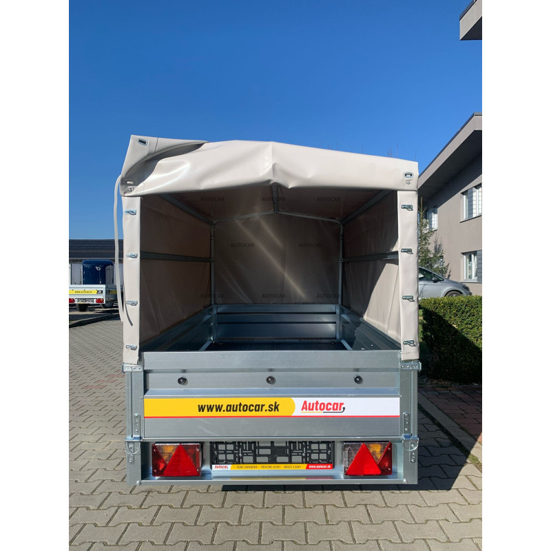 Einachsiger ungebremst Anhänger mit einem Planenaufbau von 1200 mm Höhe ab Anhängerboden. Dieser anhänger verfügt über eine Vollrahmenkonstruktion mit einer Höhe von 6 cm und zwei Querverstärkungen, die auch bei voller Beladung eine hohe Festigkeit und Stabilität gewährleisten. Zur sicheren Befestigung der Ladung befinden sich vier Verzurrösen im Boden. Der Wagen ist mit stabilen, profilierten Seitenwänden aus verzinktem Blech ausgestattet, die eine lange Lebensdauer und Korrosionsschutz gewährleisten. Die hintere bordwand lässt sich öffnen und abnehmen , was das Be- und Entladen von Gütern erleichtert.