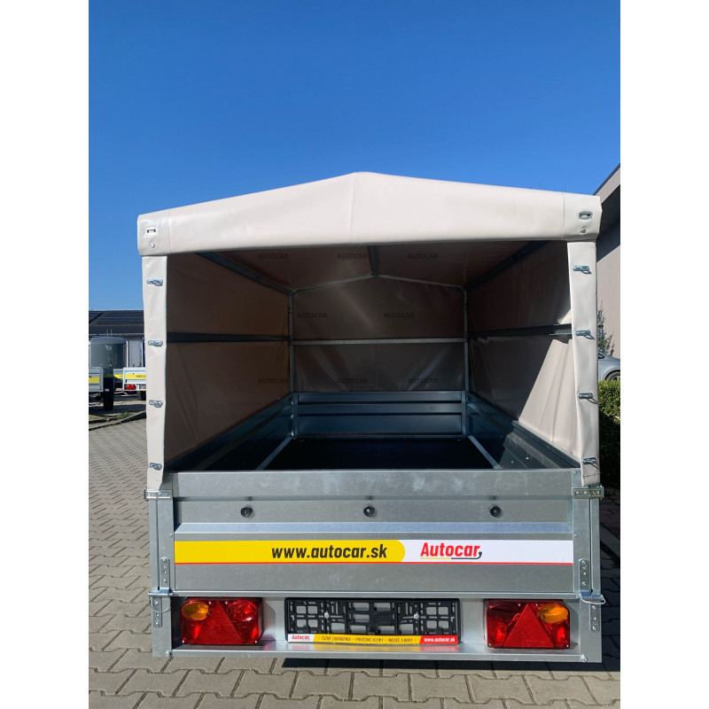 Einachsiger ungebremst Anhänger mit einem Planenaufbau von 1200 mm Höhe ab Anhängerboden. Dieser Anhänger verfügt über eine Vollrahmenkonstruktion mit 6 cm Höhe und drei Querverstärkungen, die auch bei voller Beladung für hohe Festigkeit und Stabilität sorgen. Zur sicheren Befestigung der Ladung befinden sich vier Verzurrösen im Boden. Der Wagen ist mit stabilen, profilierten Seitenwänden aus verzinktem Blech ausgestattet, die eine lange Lebensdauer und Korrosionsschutz gewährleisten. Die hintere bordwand lässt sich öffnen und abnehmen , was das Be- und Entladen von Gütern erleichtert.
