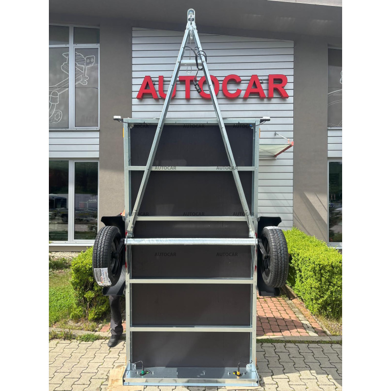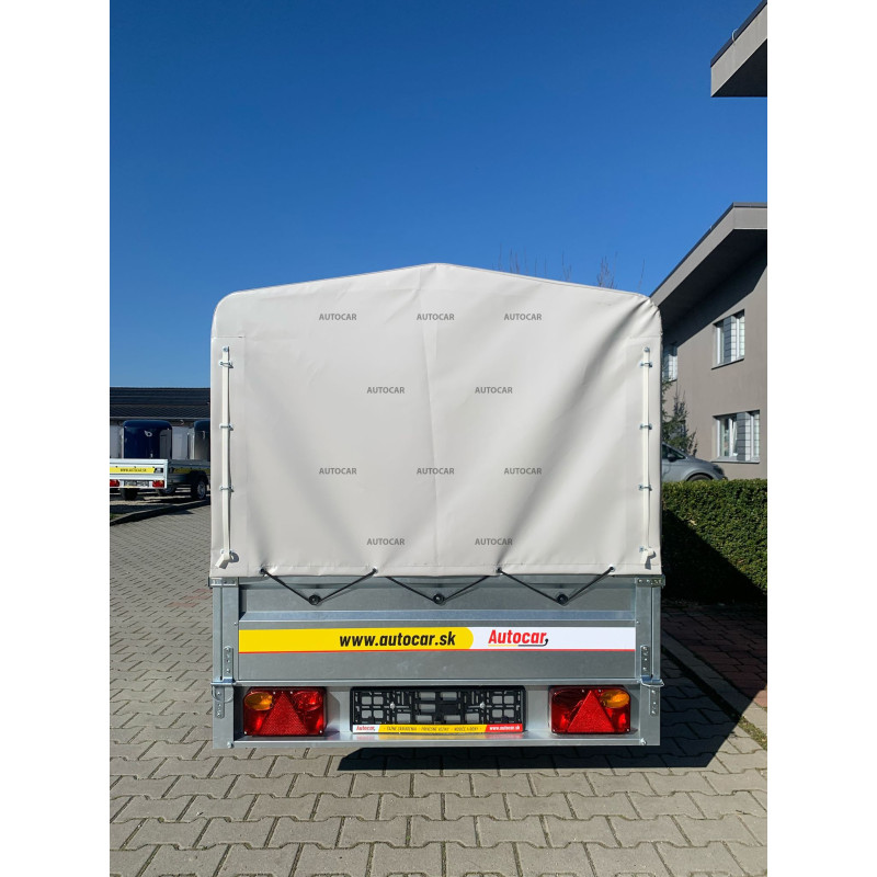Einachsiger ungebremst Anhänger mit einer Plane von 120 cm Höhe vom Anhängerboden und einem Vollrahmen Die 6 cm hohe Konstruktion und vier Verstärkungen sorgen für hohe Stabilität und Stabilität auch bei voller Beladung. Vier Verankerungsösen im Boden dienen zur sicheren Befestigung der Ladung. Der Wagen ist mit robusten, profilierten Seitenwänden aus verzinktem Blech ausgestattet, die eine lange Lebensdauer und Korrosionsschutz gewährleisten. Die hintere bordwand ist öffenbar und abnehmbar , was das Be- und Entladen von Waren erleichtert.