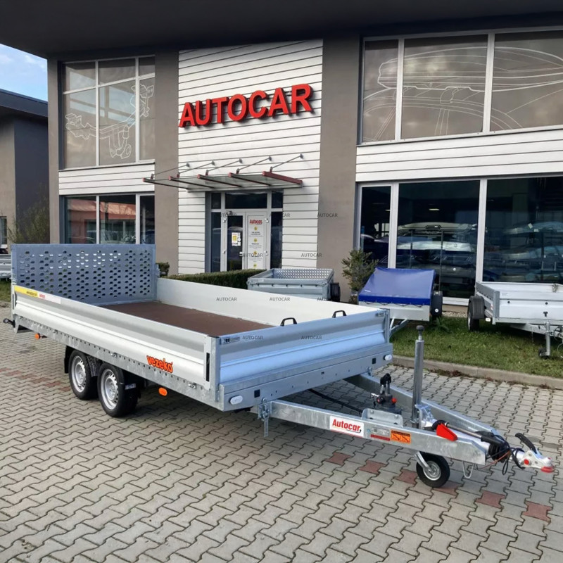 Universeller zwei-achse gebremst Transporter mit unter der Ladefläche verstauten Rädern. Standardmäßig ist es mit Aluminium-Seitenwänden mit einer Höhe von 350 mm ausgestattet, die sich zu einem „Plateau“ zerlegen lassen. Für unterschiedliche Bedürfnisse kann er alternativ auch in der Ausführung „Plateau mit Reling“ bestellt werden. Die Konstruktion besteht aus einer robusten feuerverzinkten Schweißstahlkonstruktion , die Langlebigkeit und lange Lebensdauer garantiert. Der Boden des Anhängers besteht aus wasserfestem, rutschfestem Sperrholz . In der Grundausstattung verfügt es über: manuelle, einfachwirkende hydraulische Klappung, Stützrad, Fundamentkeile. Es ist möglich, ein Blatt zu bestellen.