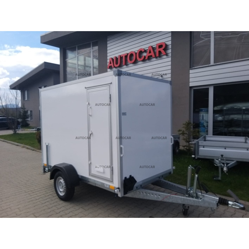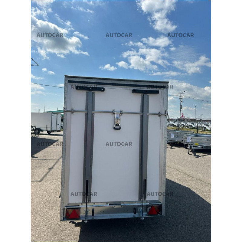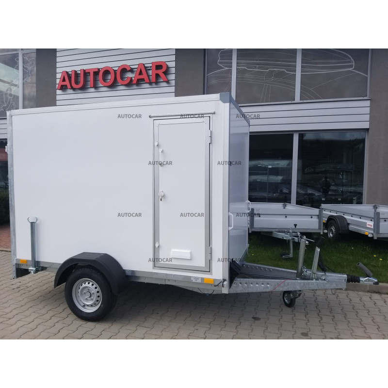 Einachsiger gebremster Kastenanhänger bis 1300 kg ist ein kompakter und praktischer Transportmittel, häufig genutzt zum Transport verschiedener Ladungen. Die Wände des Anhängers sind aus Sperrholz gefertigt und der Boden aus wasserfestem Sperrholz. In der Standardausführung ist der Kasten weiß und verfügt über seitliche Service-Türen. Der Anhänger ist mit einer Rampe ausgestattet, die als Auffahrt dient. Die Grundausstattung umfasst Befestigungselemente im Boden, die zur Sicherung der Ladung mit Gurten oder Seilen dienen, um deren Bewegung während des Transports zu verhindern. Darüber hinaus verfügen diese Anhänger über hintere Stützbeine, die das Fahrzeug während des Beladens und Entladens stabilisieren. Weitere Bestandteile sind Unterlegkeile, die zur Sicherung der Anhängerachse verwendet werden, um deren Bewegung während des Stehens zu verhindern.