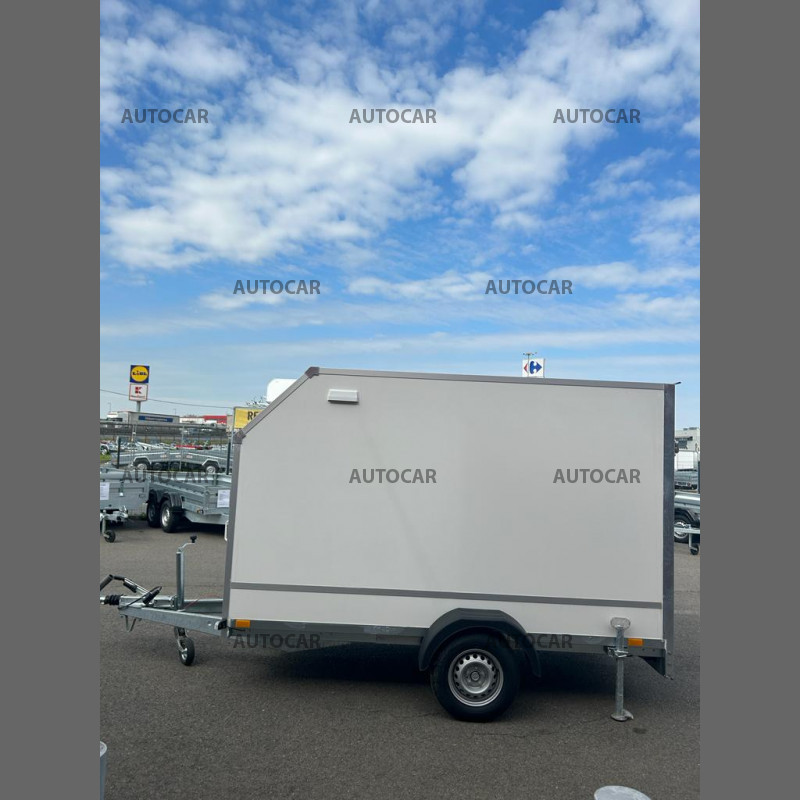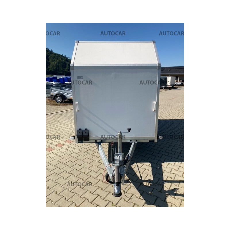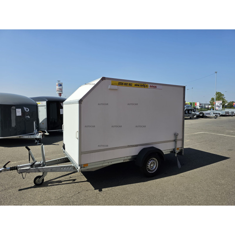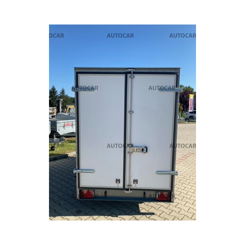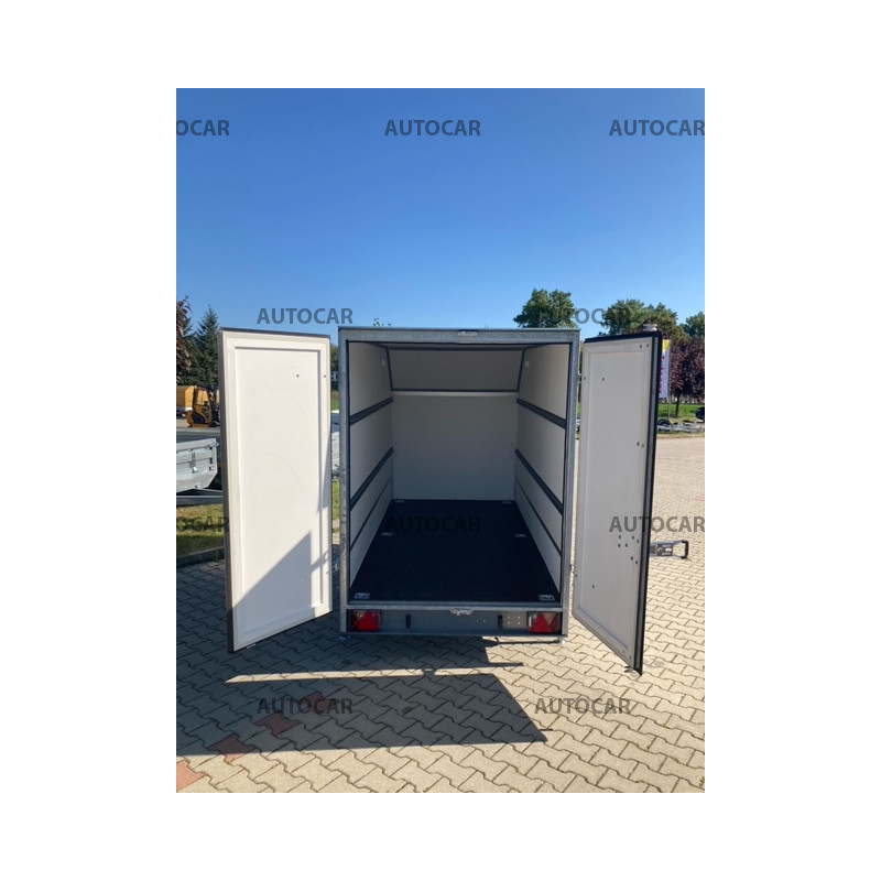 Einachsiger gebremster Kastenanhänger mit Neigung bis 1300 kg ist ein kompakter und praktischer Transportmittel, häufig verwendet für den Transport unterschiedlicher Ladungen. Die Wände des Anhängers bestehen aus Sperrholz, der Boden ist aus wasserfestem Sperrholz. In der Standardausführung ist die Karosserie weiß. Der Anhänger ist mit Flügeltüren hinten ausgestattet. Zur Grundausstattung gehören Befestigungselemente im Boden, die zur Sicherung der Ladung mit Gurten oder Seilen verwendet werden, um eine Bewegung während des Transports zu verhindern. Darüber hinaus verfügen diese Anhänger über rückwärtige Stützbeine, die das Fahrzeug beim Laden und Entladen stabilisieren. Weitere Teile sind die Stützkeile, die verwendet werden, um das Rad des Anhängers zu blockieren, damit es beim Parken nicht bewegt wird.