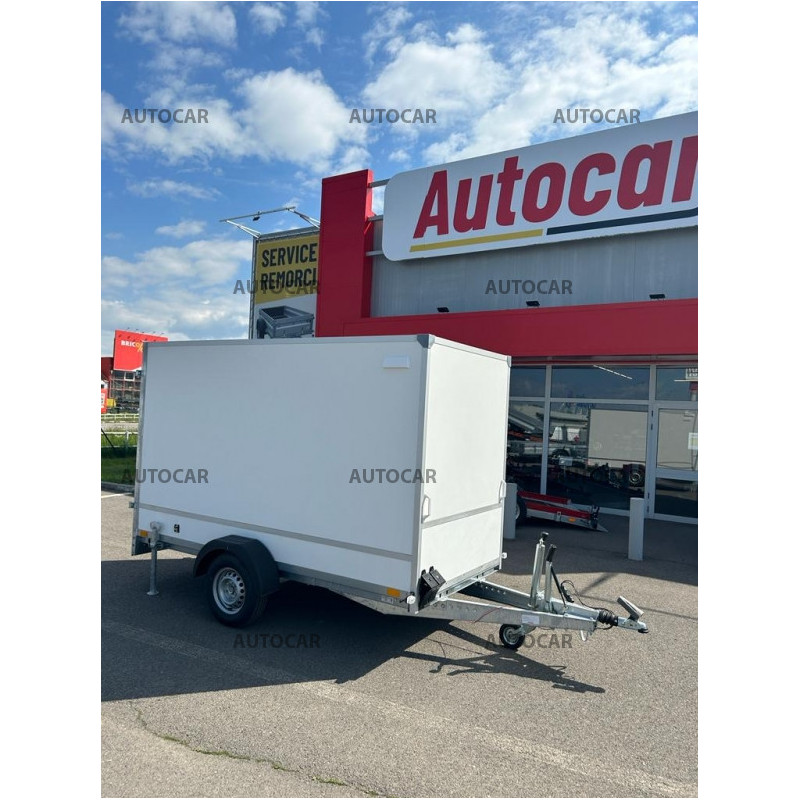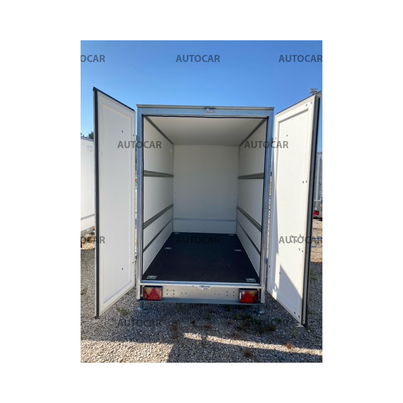 Einachsiger gebremster Kastenanhänger bis 1300 kg ist ein kompakter und praktischer Transportmittel, häufig genutzt zum Transport verschiedener Ladungen. Die Wände sind aus Sperrholz gefertigt und der Boden aus wasserfestem Sperrholz bietet einen geschlossenen Raum und schützt die Ladung vor ungünstigen äußeren Einflüssen und Wetterbedingungen. In der Standardausführung ist der Kasten weiß. Der Anhänger ist mit doppelflügeligen Türen ausgestattet. Die Grundausstattung umfasst Befestigungselemente im Boden, die zur Sicherung der Ladung mit Gurten oder Seilen dienen, um deren Bewegung während des Transports zu verhindern. Darüber hinaus verfügen diese Anhänger über hintere Stützbeine, die das Fahrzeug während des Beladens und Entladens stabilisieren. Weitere Bestandteile sind Unterlegkeile, die zur Sicherung der Anhängerachse verwendet werden, um deren Bewegung während des Stehens zu verhindern.