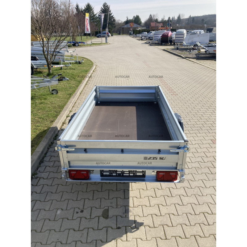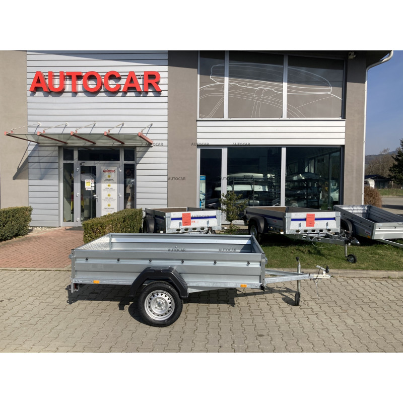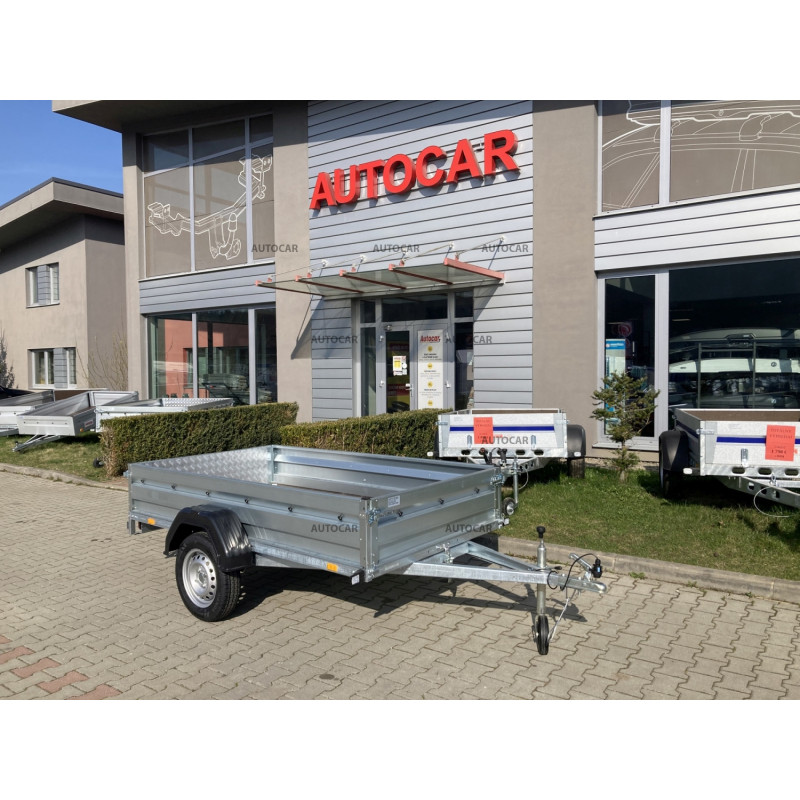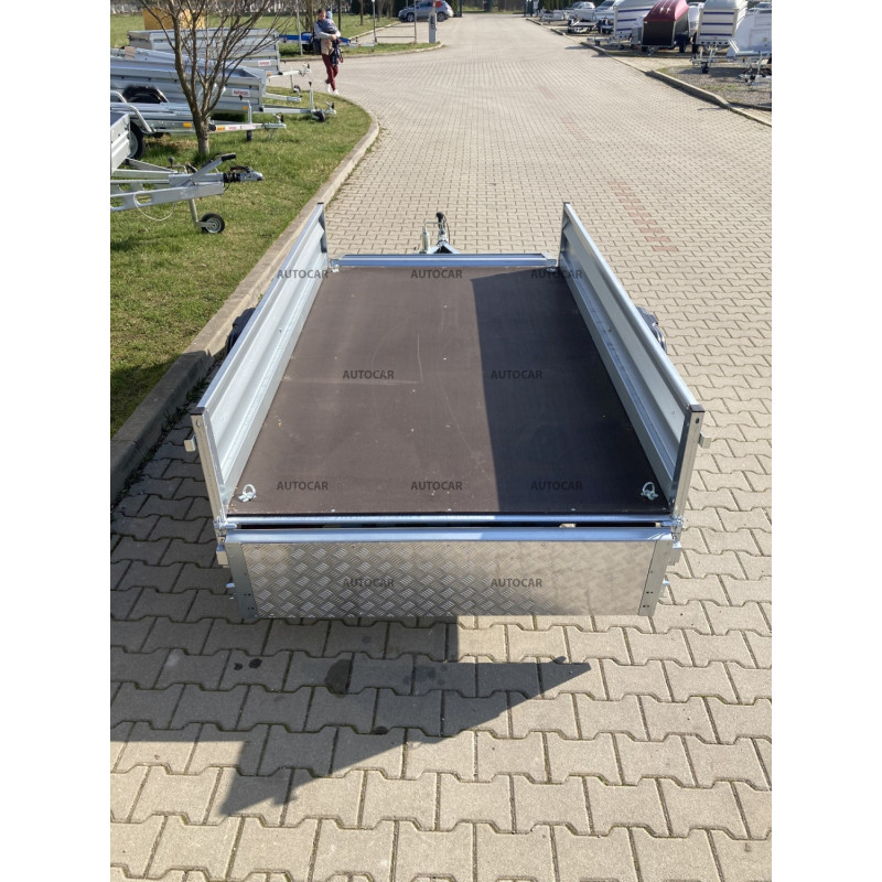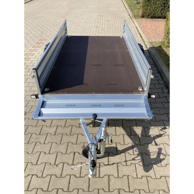 eine-achse ungebremst Klappanhänger mit Pritsche und Rädern neben der Ladefläche. Alle Elemente sind feuerverzinkt – Rahmen, Deichseln, Halterungen. Die langen Achshalterungen werden an drei Befestigungspunkten verschraubt. Der Anhänger hat einen Boden aus wasserdichtem Sperrholz und die Seiten sind kaltgepresst, um eine bessere Festigkeit und Härte der Seite selbst zu gewährleisten. Diese Lösung garantiert eine noch höhere Steifigkeit und Haltbarkeit des Anhängers als die meisten verwendeten Zweipunkt-Sets. anhänger verfügt außerdem über eine Öffnungs- und Entnahmemöglichkeit für die Vorder- und Rückseite.