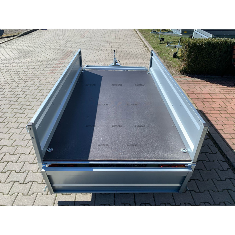 Der zweiachsige, ungebremst Anhänger mit robustem, 7 cm hohem geschweißt und Querverstärkung stellt eine zuverlässige Lösung für den Transport jeglicher Ladung dar. Sein U-Profilrahmen und die C-Profildeichsel bestehen aus bis zu 2,5 mm dickem Material. Seine breite Ladefläche mit den Maßen 2335 x 1230 und einer bordwände von 390 mm, aber das Wichtigste ist die bordwände von bis zu 1 mm, die Stabilität und Haltbarkeit garantiert. Dieser Wagen ist mit einem wasserfesten Sperrholzboden mit vier Bodenösen ausgestattet. Die klappbare Konstruktion der 8 cm hohen Deichsel ermöglicht ein einfaches Be- und Entladen der Ladung und macht diesen Anhänger für verschiedene Transportzwecke geeignet. anhänger verfügt neben der Kippfunktion auch über eine Frontöffnung und stützrad .