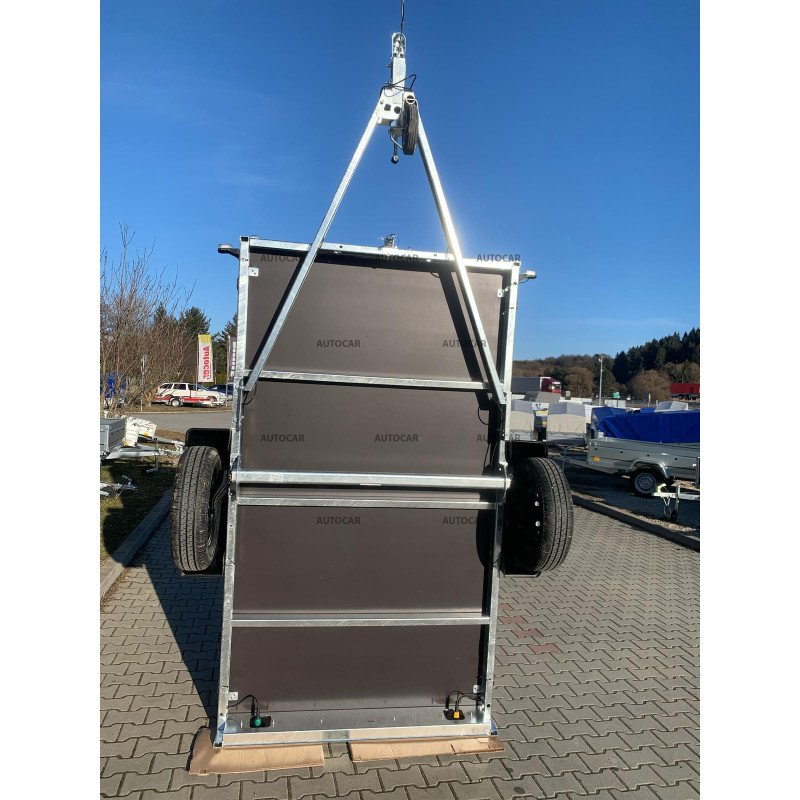 Zusammenklappbarer eine-achse ungebremst anhänger mit robustem geschweißt (7 cm) mit 3-facher Querverstärkung, der Stabilität und Langlebigkeit gewährleistet. Die Ladefläche von 2359 × 1230 mm mit 390 mm Seitenwänden (1 mm stark) bietet viel Platz. Der wasserfeste Sperrholzboden mit Ösen ermöglicht eine sichere Ladungssicherung. Der Wagen verfügt über eine klappbare Deichselstruktur (8 cm) zum einfachen Beladen, eine nach vorne zu öffnende Front und stützrad . Ein zuverlässiger und praktischer Helfer für den Transport verschiedenster Güter.