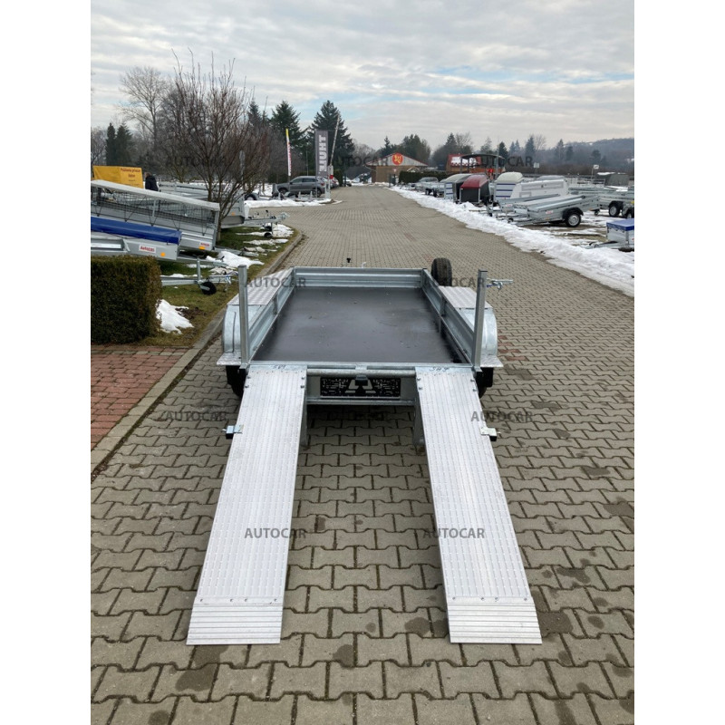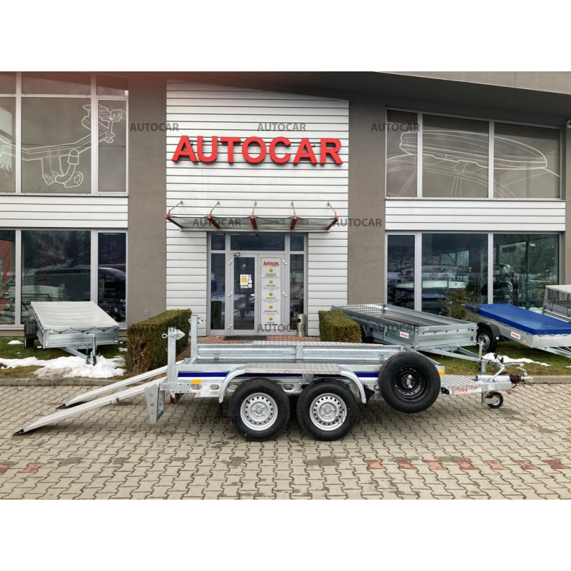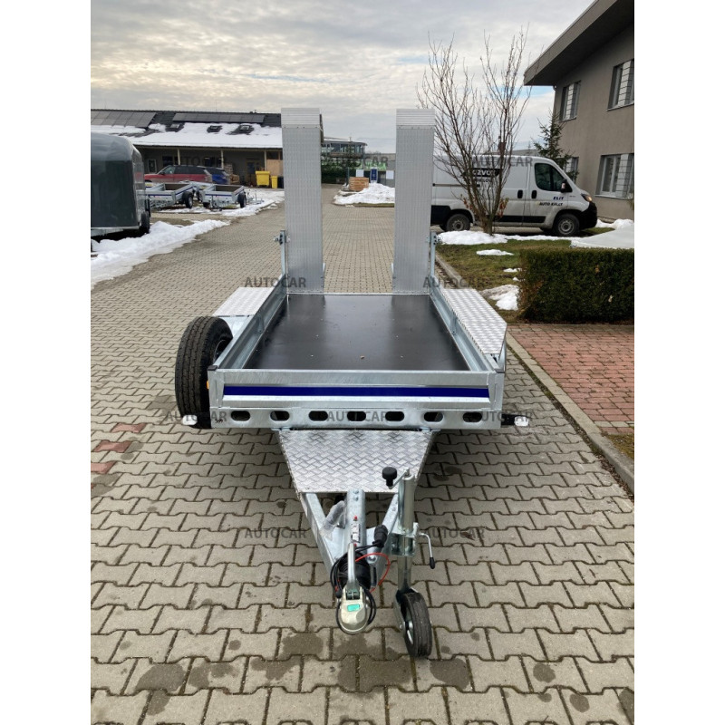 Zweiachsiger gebremster Lastanhänger für den Transport von Baumaschinen mit Rädern, die neben der Ladefläche platziert sind. Einfaches Auffahren der Maschine wird durch Auffahrrampen ermöglicht. Die Konstruktion besteht aus einem robusten, feuerverzinkten, geschweißten Stahlrahmen, der eine lange Lebensdauer garantiert. Standardausstattung: 4x Halterungen zur Befestigung der Maschine, Boden aus wasserfestem Sperrholz, Stützrad, Keile. Der Anhänger hat eine Garantie von 2 Jahren und ist für eine Geschwindigkeit von 130 km/h ausgelegt.