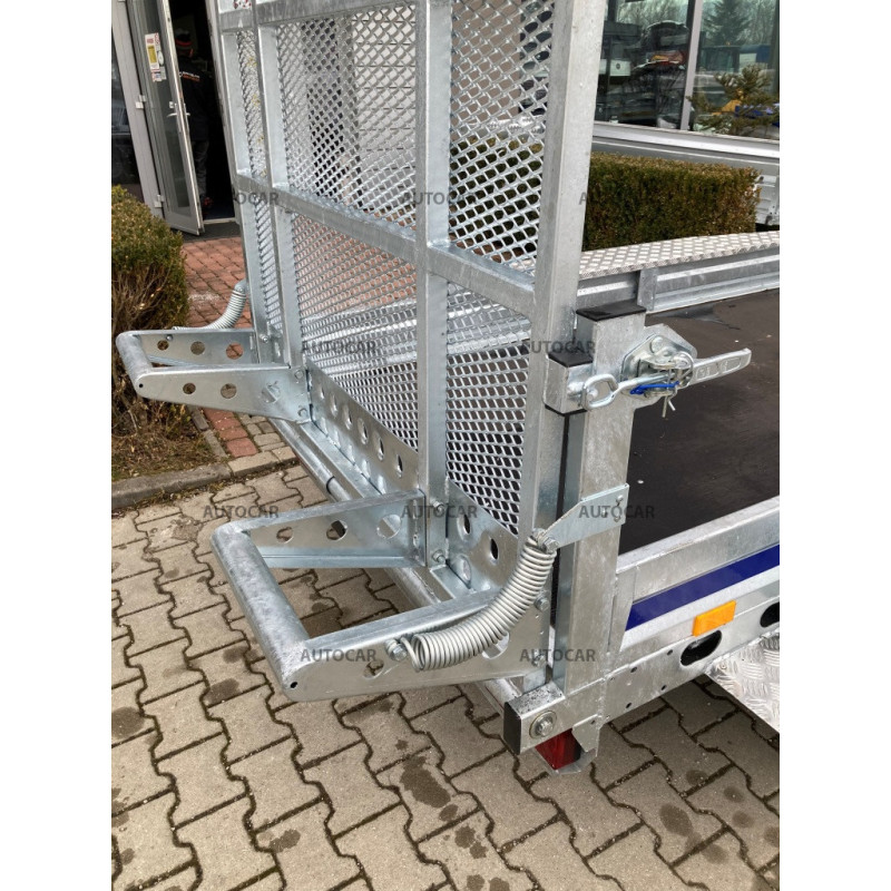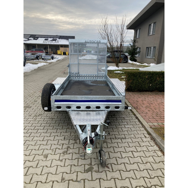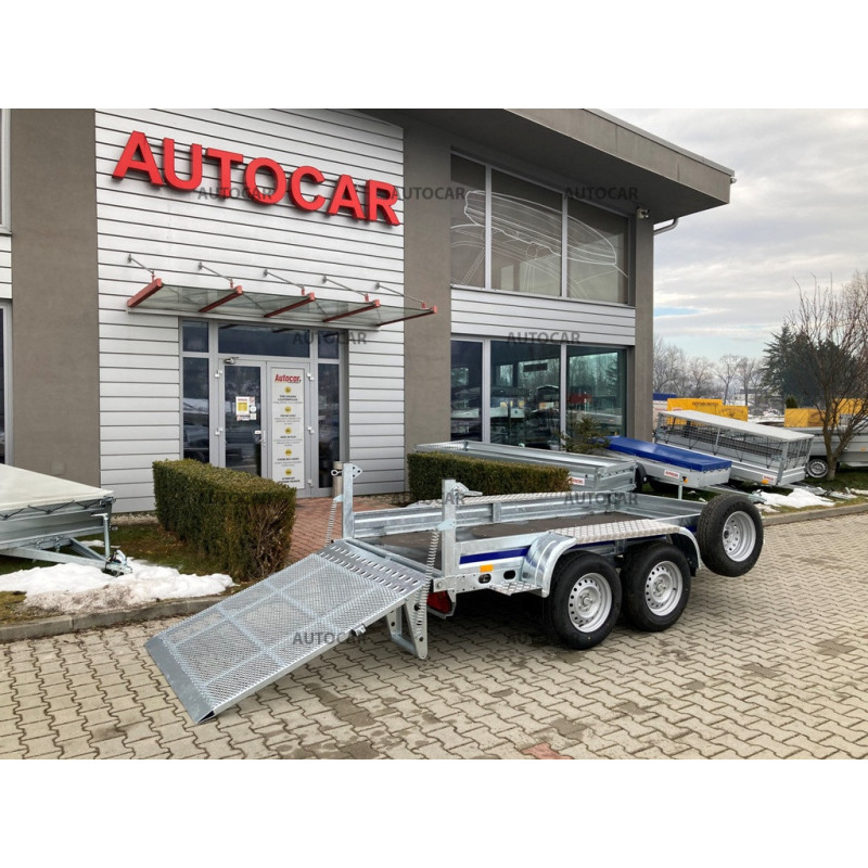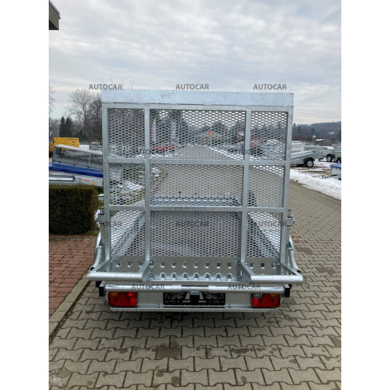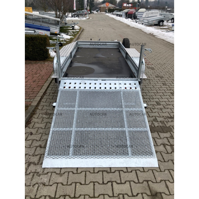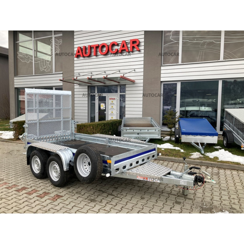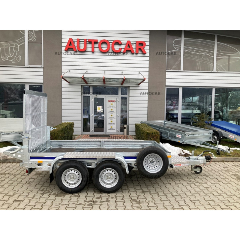 Doppachser, gebremster Transportanhänger für Baumaschinen mit Rädern, die neben der Ladefläche angebracht sind. Das einfache Auffahren mit dem Gerät wird durch eine Rampe ermöglicht. Die Konstruktion besteht aus einem robusten, feuerverzinkten, geschweißten Stahlrahmen, der eine lange Lebensdauer gewährleistet. Die Grundausstattung umfasst: 4x Befestigungspunkte für das Gerät, wasserdichte Sperrholzplatte, Stützrad, Stützkeile. Der Anhänger hat eine Garantie von 2 Jahren und ist für eine Geschwindigkeit von 130 km/h ausgelegt.