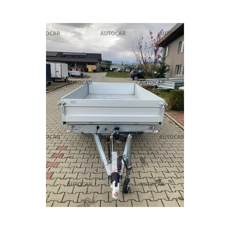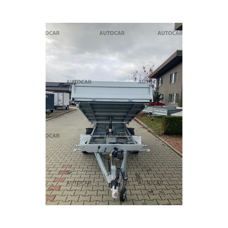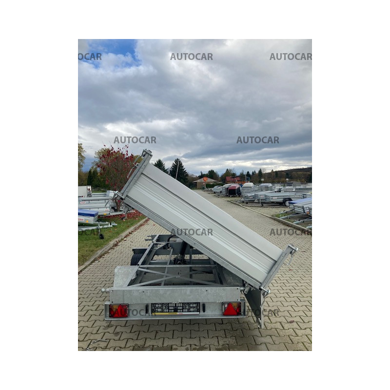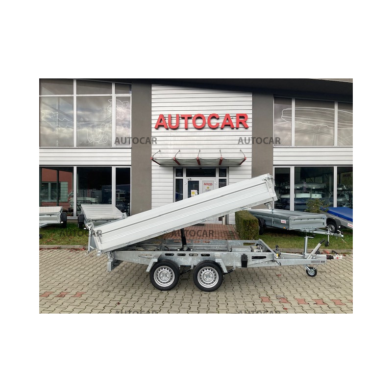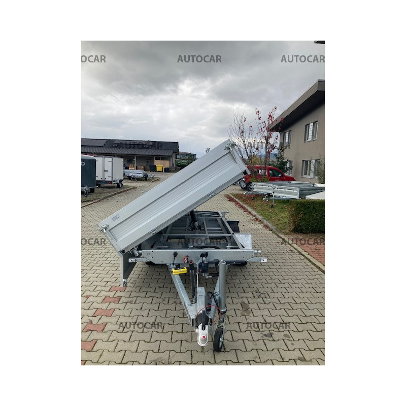 Trilaterale hydraulisch klappbar Anhänger mit Rädern liegen unter einer Ladefläche. Kippen hydraulischen Widder sichert Qualität. Änderung der Parteien Tilt bietet starke Seiten. Trailer kann mit Elektro-Motor ausgestattet werden. Die serienmäßige Ausstattung mit seitlichen Elementen aus Aluminium, die entfernt werden kann, ist ausgestattet .. Struktur besteht aus feuerverzinktem verschweißt robuste Stahlkonstruktion, die eine lange Lebensdauer gewährleistet. Die Basisversion ist: Ersatzrad mit Halterung, mit 6 Schlafplätzen in das Auge des Bodens, wasserfestem Sperrholz Boden mit einem Blatt mit einer Dicke von 3 mm bedeckt ist, unterstützt ein Unterlegkeil, Aluminium-Seitenteile, mit Öffnung hinten anheben, manuelle hydraulische Neigung kombiniert. Trailer hat eine Garantie von 2 Jahren und ist für Tempo 100 ausgelegt km / h.