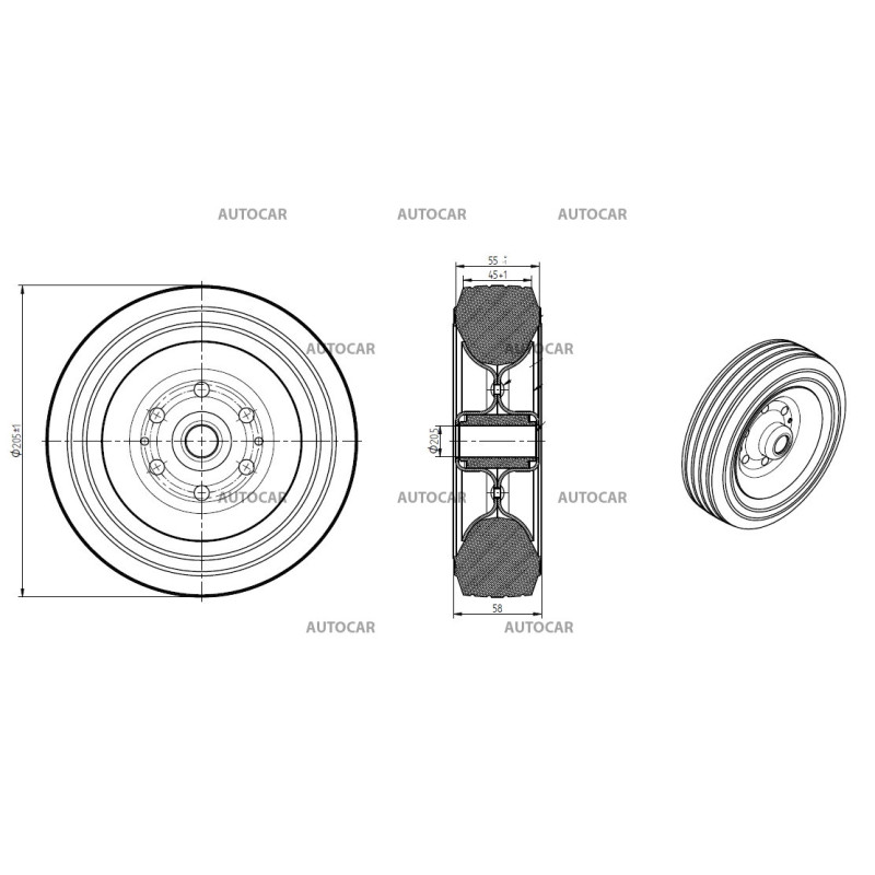 Ersatzrad für stützrad mit einem Durchmesser von 200 mm und einer Breite von 58 mm sowie einem Mittelloch mit einem Durchmesser von 205 mm.