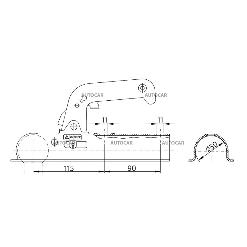 Aufhängegelenk bis 800 kg für Runddeichseln mit einer Größe von 50 mm, einer maximalen Stützlast von 75 kg und einem Abstand der Befestigungslöcher von 90 mm. Der Griff ist mit einem Push-Lock und einem Schloss für den Anhänger ausgestattet.