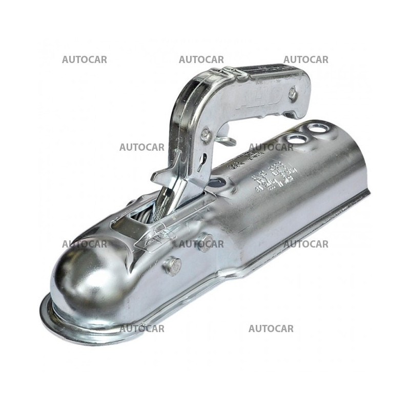 Aufhängegelenk bis 750 kg für Runddeichseln mit einer Größe von 60 mm, einer maximalen Stützlast von 75 kg und einem Abstand der Befestigungslöcher von 90 mm und 116 mm. Der Griff ist mit einem Push-Lock und einem Platz für ein Anhängerschloss ausgestattet.