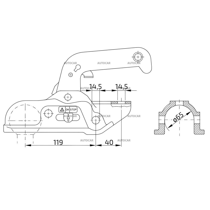 Robustes Anhängergelenk aus Gusseisen, ausgelegt für ein Anhängergesamtgewicht von bis zu 3500 kg und eine maximale Stützlast von 200 kg. Das Gelenk ist für Deichseln mit 65 mm Durchmesser geeignet und verfügt über Befestigungslöcher mit 14,5 mm Durchmesser für M14-Schrauben. Einer der Hauptvorteile ist der selbsteinstellende Mechanismus , der während der gesamten Lebensdauer keine Einstellungen erfordert. Der Verschleißgrad der Kupplung oder des Kugelbolzens lässt sich leicht mithilfe der durchsichtigen Seitenanzeige überprüfen.