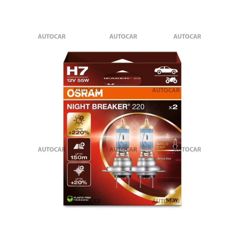 Mit NIGHT BREAKER 220 – dem hellsten Halogen-Autolicht von OSRAM. Diese hochmodernen Autoleuchten überzeugen mit bis zu 220 % mehr Helligkeit und bis zu 20 % weißerem Licht im Vergleich zum gesetzlichen Mindeststandard und erzeugen eine Leuchtweite von bis zu 150 m. Mehr Licht und eine bessere Sicht können dazu beitragen, dass Fahrer Verkehrsgefahren schneller erkennen und darauf reagieren können. Die ideale Lampe für Autofahrer, die den Unterschied schätzen, den eine leistungsstarke Fahrzeugbeleuchtung macht. Die Lichter haben goldene Kappen.