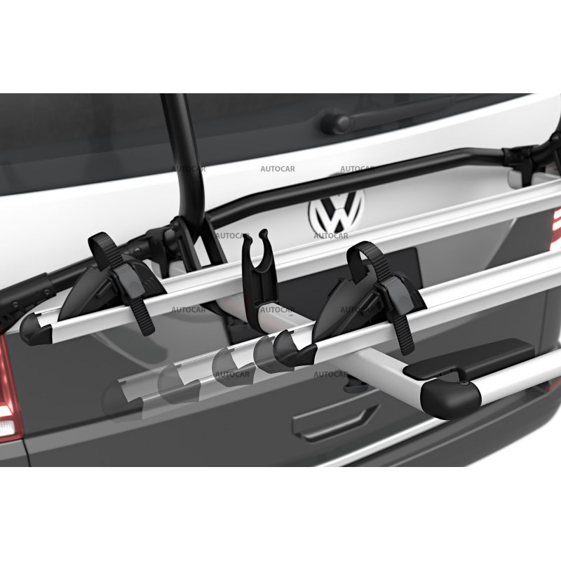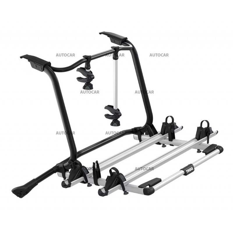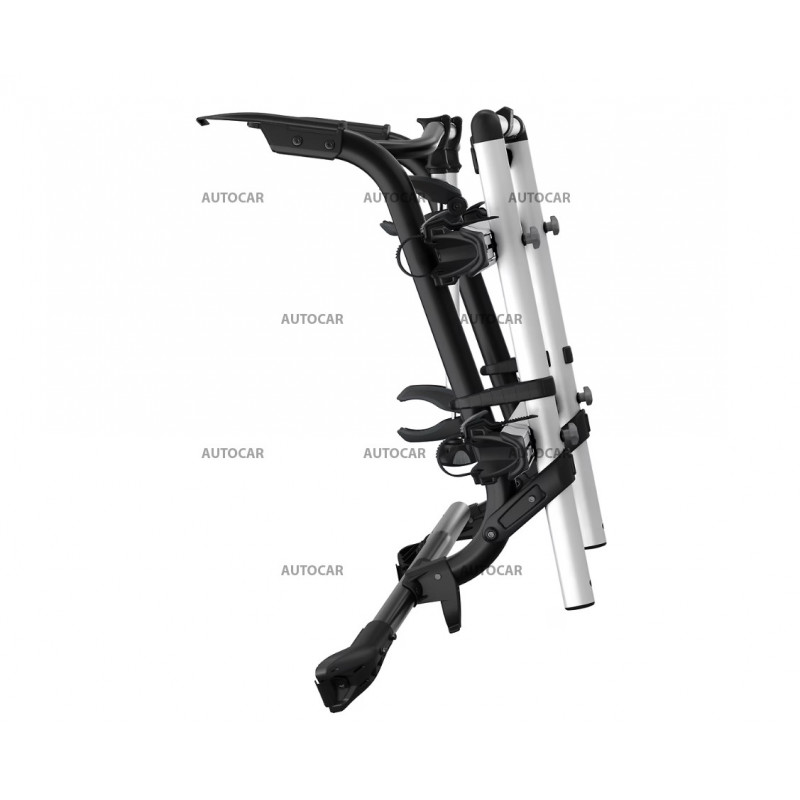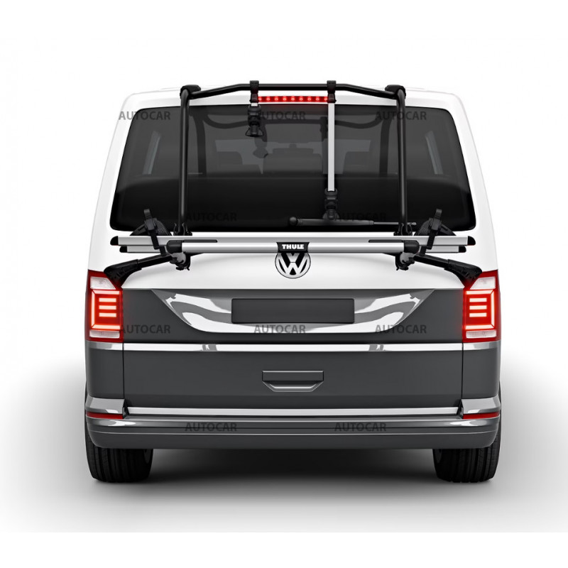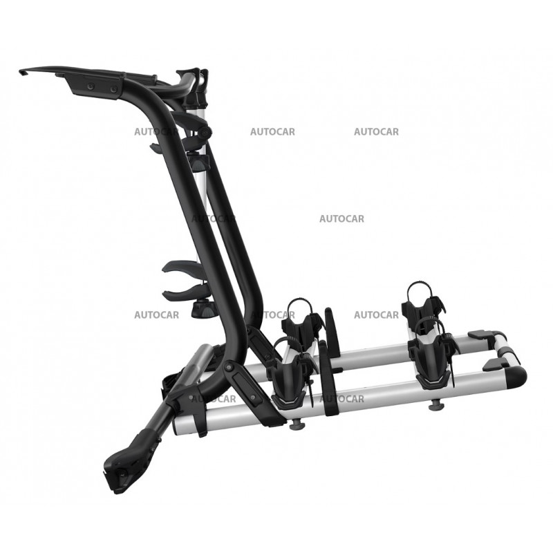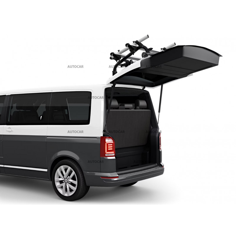 Thule Fahrradträger für unkomplizierte Ausflüge mit erhöhter Plattform, bei der die Rückleuchten und das Kennzeichen sichtbar bleiben.