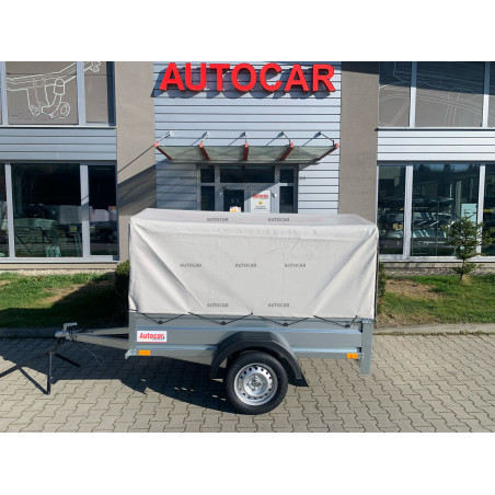 Plane mit Gestell für einen Anhänger A210 mit einer Höhe vom Boden bis zum höchsten Punkt der Plane von 100 cm und einer Breite von 114 cm. Das Gestell besteht aus gebogenen Profilen und die Rückseite der Plane lässt sich öffnen.